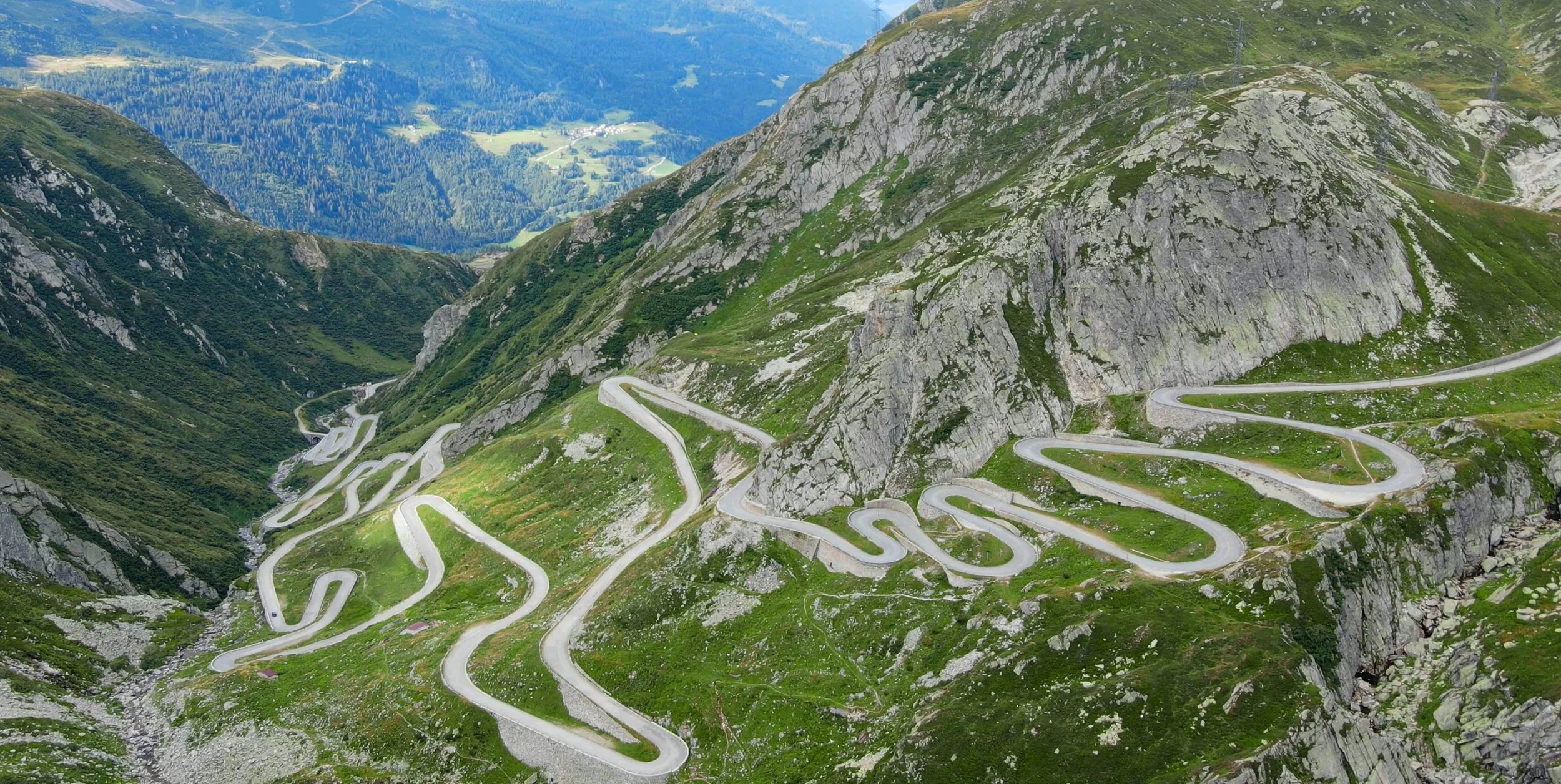 Aerial view of a winding mountain road with sharp curves, surrounded by green hills and rocky terrain.